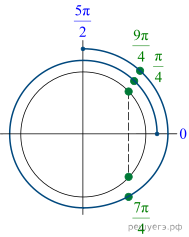 Отберём корни при помощи тригонометрической окружности (см. рис.). На заданном промежутке лежат корни: